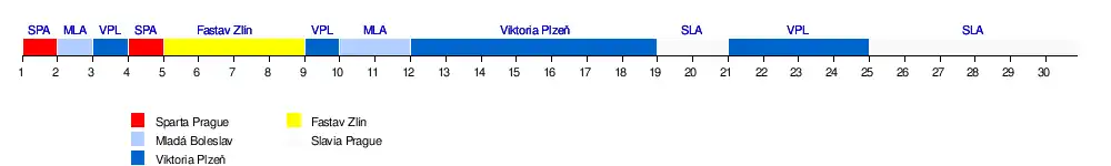 | Viktoria Plzeň | 7 | 6 | 1 | 5 | 4 | 4 | 3 | 3 | 1 | 2 | 2 | 1 | 1 | 1 | 1 | 1 | 1 | 1 | 2 | 2 | 1 | 1 | 1 | 1 | 2 | 2 | 2 | 2 | 2 | 2 | 13 | |