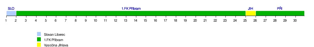 | 1.FK Příbram | 13 | 16 | 16 | 16 | 16 | 16 | 16 | 16 | 16 | 16 | 16 | 16 | 16 | 16 | 16 | 16 | 16 | 16 | 16 | 16 | 16 | 16 | 16 | 16 | 15 | 16 | 16 | 16 | 16 | 16 | 29 |