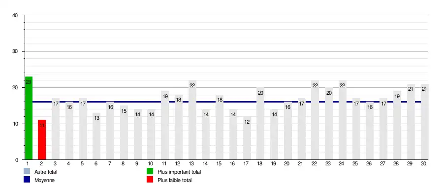 Ce graphique représente le nombre de buts marqués lors de chaque journée, pour un total de 515 buts en 30 journées (soit 17,17 par journée et 2,14 par match) :