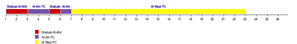 | Al Wasl | 7 | 3 | 3 | 3 | 3 | 2 | 1 | 1 | 1 | 1 | 1 | 1 | 1 | 1 | 1 | 1 | 1 | 1 | 1 | 1 | 1 | 1 | 16 | |||||