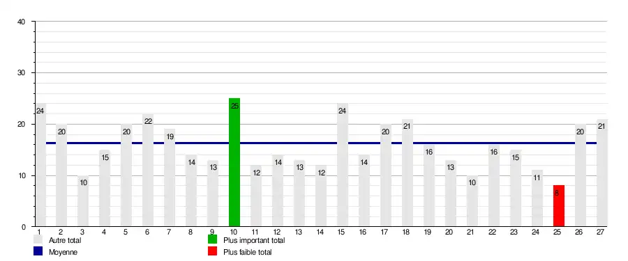 | Journée → | 1 | 2 | 3 | 4 | 5 | 6 | 7 | 8 | 9 | 10 | 11 | 12 | 13 | 14 | 15 | 16 | 17 | 18 | 19 | 20 | 21 | 22 | 23 | 24 | 25 | 26 | 27 | 1er | rel. |