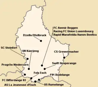 | Fola Esch (promu de D2) | Emile Mayrisch | 3 900 | Esch-sur-Alzette |