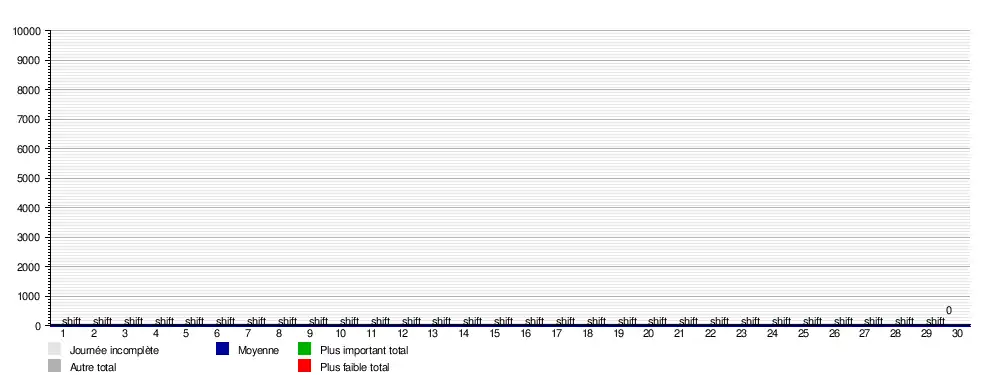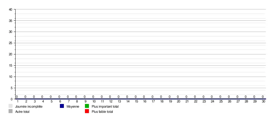| Journées → | 1 | 2 | 3 | 4 | 5 | 6 | 7 | 8 | 9 | 10 | 11 | 12 | 13 | 14 | 15 | 16 | 17 | 18 | 19 | 20 | 21 | 22 | 23 | 24 | 25 | 26 | 27 | 28 | 29 | 30 | prom. | bar. | rel. |