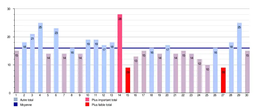| Journée | 1 | 2 | 3 | 4 | 5 | 6 | 7 | 8 | 9 | 10 | 11 | 12 | 13 | 14 | 15 | 16 | 17 | 18 | 19 | 20 | 21 | 22 | 23 | 24 | 25 | 26 | 27 | 28 | 29 | 30 | Total |