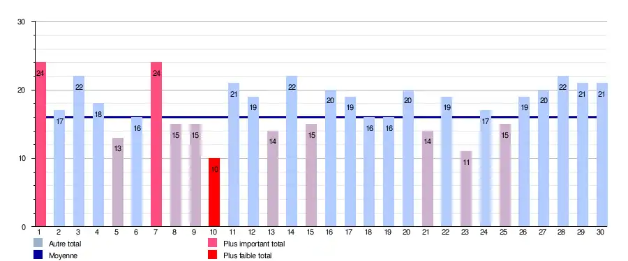 | Journée | 1 | 2 | 3 | 4 | 5 | 6 | 7 | 8 | 9 | 10 | 11 | 12 | 13 | 14 | 15 | 16 | 17 | 18 | 19 | 20 | 21 | 22 | 23 | 24 | 25 | 26 | 27 | 28 | 29 | 30 | Total |