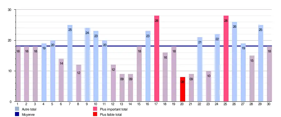 | Journée | 1 | 2 | 3 | 4 | 5 | 6 | 7 | 8 | 9 | 10 | 11 | 12 | 13 | 14 | 15 | 16 | 17 | 18 | 19 | 20 | 21 | 22 | 23 | 24 | 25 | 26 | 27 | 28 | 29 | 30 | Total |