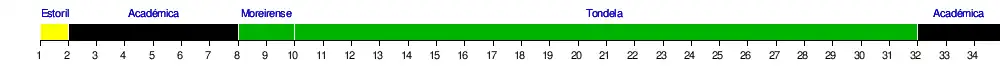| Tondela | 12 | 16 | 12 | 15 | 16 | 16 | 16 | 16 | 16 | 18 | 18 | 18 | 18 | 18 | 18 | 18 | 18 | 18 | 18 | 18 | 18 | 18 | 18 | 18 | 18 | 18 | 18 | 18 | 18 | 18 | 18 | 17 | 17 | 16 |