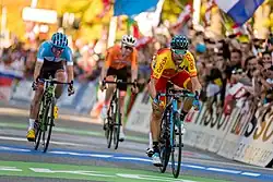 Peter Sagan sacré triple champion du monde consécutivement en 2015, 2016 et 2017, avec sa tunique arc en ciel en 2016.