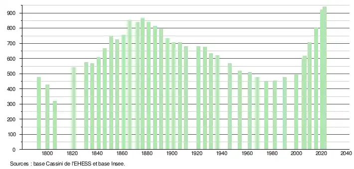 L'évolution du nombre d'habitants est connue à travers les recensements de la population effectués dans la commune depuis 1793. Pour les communes de moins de 10 000 habitants, une enquête de recensement portant sur toute la population est réalisée tous les cinq ans, les populations de référence des années intermédiaires étant quant à elles estimées par interpolation ou extrapolation[22]. Pour la commune, le premier recensement exhaustif entrant dans le cadre du nouveau dispositif a été réalisé en 2005[23].