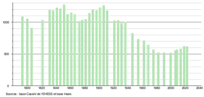 L'évolution du nombre d'habitants est connue à travers les recensements de la population effectués dans la commune depuis 1793. Pour les communes de moins de 10 000 habitants, une enquête de recensement portant sur toute la population est réalisée tous les cinq ans, les populations de référence des années intermédiaires étant quant à elles estimées par interpolation ou extrapolation[20]. Pour la commune, le premier recensement exhaustif entrant dans le cadre du nouveau dispositif a été réalisé en 2008[21]. En 2022, la commune comptait 615 habitants[Note 2], en évolution de +2,33 % par rapport à 2016 (Corrèze : −0,59 %, France hors Mayotte : +2,11 %).