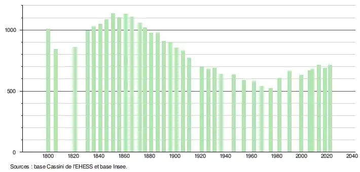L'évolution du nombre d'habitants est connue à travers les recensements de la population effectués dans la commune depuis 1800. Pour les communes de moins de 10 000 habitants, une enquête de recensement portant sur toute la population est réalisée tous les cinq ans, les populations de référence des années intermédiaires étant quant à elles estimées par interpolation ou extrapolation[23]. Pour la commune, le premier recensement exhaustif entrant dans le cadre du nouveau dispositif a été réalisé en 2008[24].