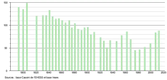 - ↑ Par convention dans Wikipédia, le principe a été retenu de n’afficher dans le tableau des recensements et le graphique, pour les populations légales postérieures à 1999, que les populations correspondant à une enquête exhaustive de recensement pour les communes de moins de 10 000 habitants, et que les populations des années 2006, 2011, 2016, etc. pour les communes de plus de 10 000 habitants, ainsi que la dernière population légale publiée par l’Insee pour l'ensemble des communes.