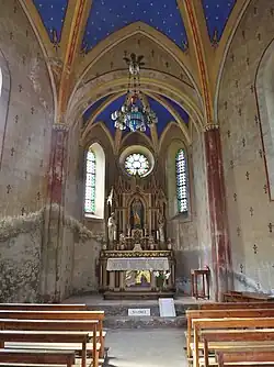 Dédiée à la Sainte-Vierge[3] sous le vocable de Notre-Dame de la Balme, les inscriptions latines « Tota - pulchra - es - Maria... » sont ainsi lisibles sur la voûte surplombant l’autel.