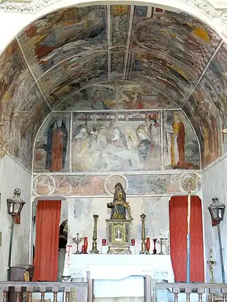 Sur le chevet, au centre une Pietà avec Marie assise au pied de la Croix tenant le Christ sur ses genoux, au-dessus, la Crucifixion avec Marie et Jean, et de part et d'autre de la Pieta, à gauche, saint Antoine, à droite, sainte Pétronille lisant.