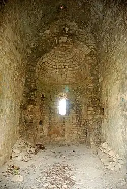 L'intérieur, en ruines et sans dallage, présente une nef aux parois de moellons, surmontée d'une voûte en berceau légèrement brisé.