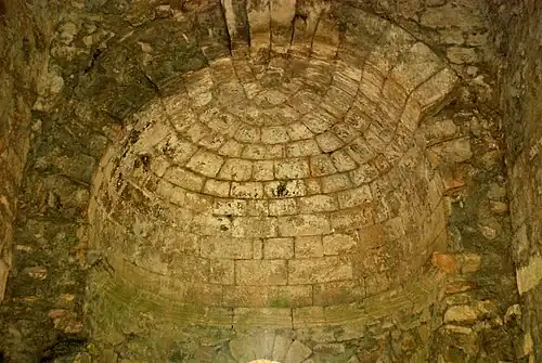 L'abside est constituée de murs en moellons surmontés d'une voûte en cul-de-four réalisée en pierre de taille assemblée en grand appareil, reposant sur une corniche moulurée.