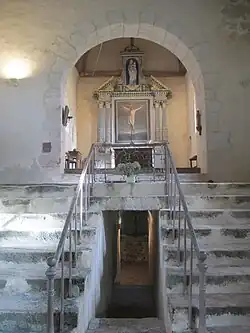 Le chœur de la chapelle se situe une dizaine de marches au-dessus de la nef. Il repose sur une crypte romane primitive dont la voûte en berceau est renforcée d'un arc doubleau[2]. Un passage vouté situé au travers de l'escalier permet de se rendre de la nef à la crypte. Deux fenêtres romanes s'ouvrent au-dessus de l'autel qui était dédié à sainte Marie Madeleine[2]. On distingue les restes de peintures murales datant de la fin du XVe siècle[5].