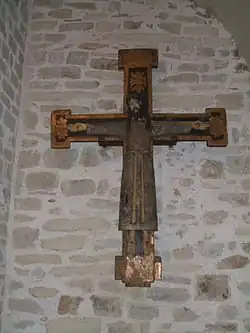 Datant vraisemblablement du XIIe siècle, il a été malencontreusement endommagé par une « restauration » abusive au XVIIIe siècle : pose d'une nouvelle couche de peinture, dorure de la croix. Heureusement, il a été récemment rétabli dans un état plus proche de l'origine. La statue, de facture plutôt soignée, présente une impression d'apaisement[réf. souhaitée], avec un Christ tenant sa tête légèrement vers la droite.