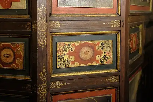 Parmi les symboles religieux on peut remarquer, en plusieurs endroits, la représentation d'un cœur avec les trois clous de la crucifixion au centre d'un soleil en gloire, symbole de la dévotion au Sacré-Cœur qui ne se diffusera que quelques années plus tard[3].