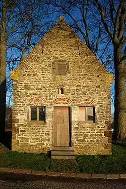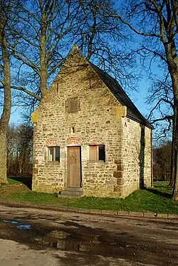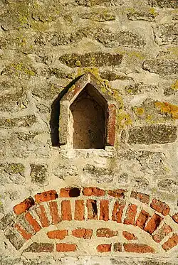 La façade occidentale, remaniée au XIXe siècle[4], est percée d'une petite porte rectangulaire et de deux petites baies carrées. Chacune de ces trois ouvertures est surmontée d'un arc de décharge en briques qui contraste avec la maçonnerie de moellons. Elle est cantonnée de chaînages d'angle réalisés au moyen de gros blocs de grès ferrugineux.