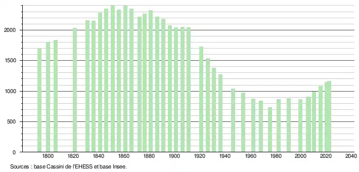 L'évolution du nombre d'habitants est connue à travers les recensements de la population effectués dans la commune depuis 1793. Pour les communes de moins de 10 000 habitants, une enquête de recensement portant sur toute la population est réalisée tous les cinq ans, les populations de référence des années intermédiaires étant quant à elles estimées par interpolation ou extrapolation[27]. Pour la commune, le premier recensement exhaustif entrant dans le cadre du nouveau dispositif a été réalisé en 2005[28].