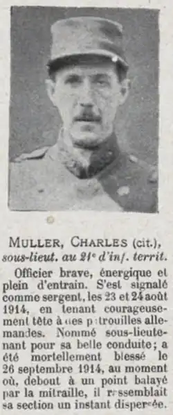 Mobilisé comme sergent de réserve au sein du 21e régiment d'infanterie territoriale en août 1914, Charles Müller participe avec bravoure à la bataille de Belgique. Nommé sous-lieutenant, il est blessé par un obus allemand à Longueval le , et meurt à l'hôpital no 5 d'Amiens des suites de ses blessures[4]. Il est inhumé à Amiens[5].