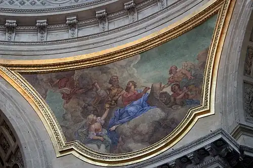 Les fresques de l’intérieur du dôme des Invalides furent son ouvrage capital. Il représente Saint Louis déposant sa couronne et son épée entre les maint de Jésus-Christ, assis au milieu d’une gloire et accompagné de la Vierge, et peint quatre pendentifs représentant les évangélistes avec leurs attributs et entourés d’anges (huile sur toile, Diam. 199 cm)[1]. Noël Cochin a gravé d’après lui ces peintures, en 22 planches. En 1771, Doyen restaura ces peintures fort endommagées par le temps.