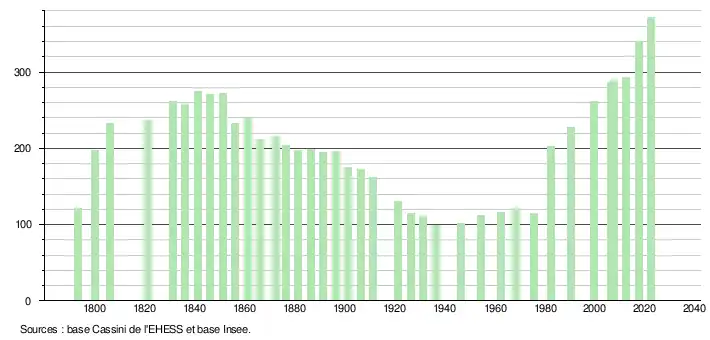 L'évolution du nombre d'habitants est connue à travers les recensements de la population effectués dans la commune depuis 1793. Pour les communes de moins de 10 000 habitants, une enquête de recensement portant sur toute la population est réalisée tous les cinq ans, les populations de référence des années intermédiaires étant quant à elles estimées par interpolation ou extrapolation[15]. Pour la commune, le premier recensement exhaustif entrant dans le cadre du nouveau dispositif a été réalisé en 2007[16].