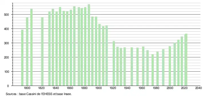 L'évolution du nombre d'habitants est connue à travers les recensements de la population effectués dans la commune depuis 1793. Pour les communes de moins de 10 000 habitants, une enquête de recensement portant sur toute la population est réalisée tous les cinq ans, les populations de référence des années intermédiaires étant quant à elles estimées par interpolation ou extrapolation[15]. Pour la commune, le premier recensement exhaustif entrant dans le cadre du nouveau dispositif a été réalisé en 2006[16].