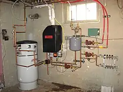 Dans la plomberie traditionnelle au Royaume-Uni, la chaudière de chauffage est mise en place pour chauffer une bouteille d'eau chaude séparée ou un chauffe-eau pour l'eau chaude sanitaire. De tels chauffe-eau sont souvent équipés d'un thermoplongeur électrique auxiliaire à utiliser si la chaudière est inactive pendant un certain temps. La chaleur provenant de la chaudière de chauffage est transférée au réservoir/récipient du chauffe-eau au moyen d'un échangeur de chaleur, et la chaudière fonctionne à une température plus élevée que celle de l'eau chaude sanitaire. La plupart des chauffe-eau en Amérique du Nord sont complètement séparés des appareils de chauffage des locaux, en raison de la popularité des systèmes HVAC/ air pulsé en Amérique du Nord.