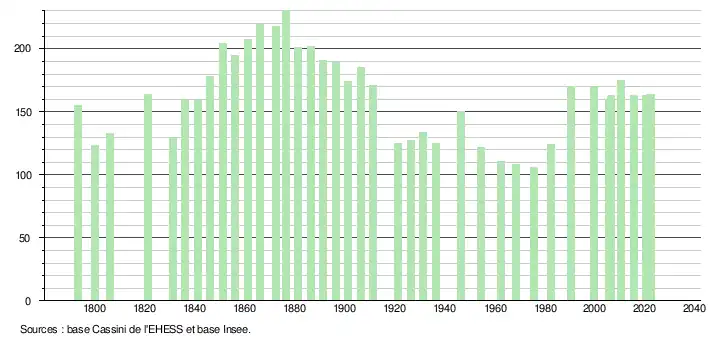 L'évolution du nombre d'habitants est connue à travers les recensements de la population effectués dans la commune depuis 1793. Pour les communes de moins de 10 000 habitants, une enquête de recensement portant sur toute la population est réalisée tous les cinq ans, les populations de référence des années intermédiaires étant quant à elles estimées par interpolation ou extrapolation[13]. Pour la commune, le premier recensement exhaustif entrant dans le cadre du nouveau dispositif a été réalisé en 2005[14].