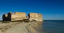À l'époque médiévale, deux fortifications défendent la route romaine : le borj El Bab en son milieu et le borj El Kantara à son arrivée sur Djerba. Le borj El Agreb[9] ou borj trig Ejmél (le fort du chemin des chameaux), est placé sur le parcours du gué caravanier, et borj El Kastil occupe, à l'est, l'extrémité de l'avancée sableuse du même nom.