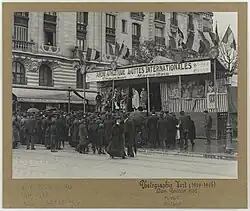 Scène de chausson marseillais, vers 1900, Paris, lors d'une rencontre sportive internationale. On y voit quatre lutteurs sur l'estrade.