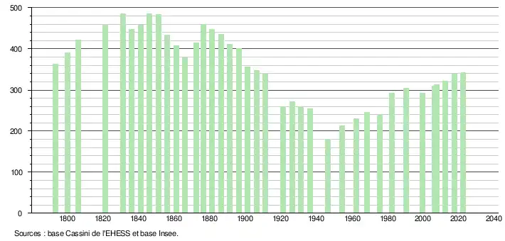 L'évolution du nombre d'habitants est connue à travers les recensements de la population effectués dans la commune depuis 1793. Pour les communes de moins de 10 000 habitants, une enquête de recensement portant sur toute la population est réalisée tous les cinq ans, les populations de référence des années intermédiaires étant quant à elles estimées par interpolation ou extrapolation[14]. Pour la commune, le premier recensement exhaustif entrant dans le cadre du nouveau dispositif a été réalisé en 2007[15].