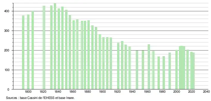 L'évolution du nombre d'habitants est connue à travers les recensements de la population effectués dans la commune depuis 1793. Pour les communes de moins de 10 000 habitants, une enquête de recensement portant sur toute la population est réalisée tous les cinq ans, les populations de référence des années intermédiaires étant quant à elles estimées par interpolation ou extrapolation[12]. Pour la commune, le premier recensement exhaustif entrant dans le cadre du nouveau dispositif a été réalisé en 2004[13].