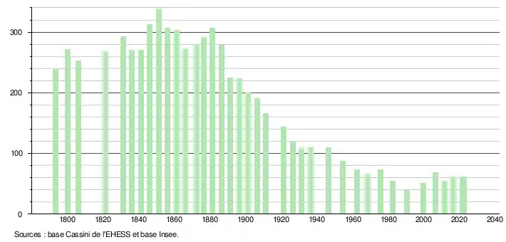 L'évolution du nombre d'habitants est connue à travers les recensements de la population effectués dans la commune depuis 1793. Pour les communes de moins de 10 000 habitants, une enquête de recensement portant sur toute la population est réalisée tous les cinq ans, les populations de référence des années intermédiaires étant quant à elles estimées par interpolation ou extrapolation[20]. Pour la commune, le premier recensement exhaustif entrant dans le cadre du nouveau dispositif a été réalisé en 2006[21].
