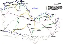 Le réseau des chemins de fer des Côtes-du-Nord a été construit en deux étapes. À son apogée, le réseau totalisait 19 lignes et 452 km. Les difficultés financières persistèrent après la reprise en régie départementale en 1920[8]. Les premières lignes furent fermées à partir de 1937[9].
