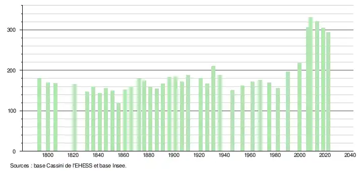 L'évolution du nombre d'habitants est connue à travers les recensements de la population effectués dans la commune depuis 1793. Pour les communes de moins de 10 000 habitants, une enquête de recensement portant sur toute la population est réalisée tous les cinq ans, les populations de référence des années intermédiaires étant quant à elles estimées par interpolation ou extrapolation[22]. Pour la commune, le premier recensement exhaustif entrant dans le cadre du nouveau dispositif a été réalisé en 2008[23].