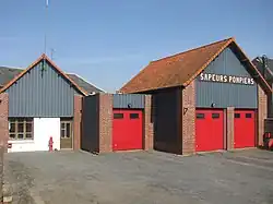 • Mairie en briques rouges, soubassement en pierre de taille, toiture en ardoise.