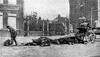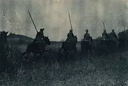 Après avoir vu les exploits des unités montées des Boers en Afrique du Sud durant la seconde guerre des Boers entre 1899 et 1902, la Grande-Bretagne augmente ses réserves de cavalerie[6]. Elles sont utilisées dès les premiers jours de la Première Guerre mondiale. Le , le premier tir britannique en Belgique est effectué par un cavalier, Edward Thomas, des 4th Royal Irish Dragoon Guards à côté de Casteau, durant une patrouille la veille de la bataille de Mons[7]. Dix-neuf jours après la première mobilisation anglo-saxonne, le , le régiment du 9th Queen's Royal Lancers, mené par David Campbell, attaque des troupes d'infanterie allemandes avec un escadron du 4th Dragoon Guards. Campbell suit les ordres qui sont de charger les lignes ennemies, même s'il pense qu'il aurait été plus prudent de se battre à pied. Les Britanniques y perdent 250 hommes et 300 chevaux. Le 7 septembre, ses troupes attaquent une nouvelle fois, cette fois-ci face au Premier corps des dragons allemand, un autre régiment de lanciers[8]. La même année, la Household Cavalry britannique accomplit son avant-dernière opération à dos de cheval, durant la Grande Retraite des Alliés. Après avoir atteint l'Aisne et la ligne de tranchées, les cavaliers se révèlent inefficaces. Alors que des divisions montées sont toujours formées en Grande-Bretagne, celles du front s'habituent rapidement à se battre à pied[9]. Les Britanniques continuent d'en utiliser tout au long de la guerre, et en 1917, la Household Cavalry lance la dernière charge à cheval dans une attaque de diversion sur la Ligne Hindenburg, près d'Arras. Sur les ordres du Field Marshal Douglas Haig, les Life Guards et Horse guards, accompagnés par les hommes de la 10th Royal Hussars, attaquent sous les tirs massifs des mitrailleuses allemandes et à travers les fils de fer barbelé. Les hussards y perdent les deux-tiers de leurs hommes[9],[El 2]. La dernière perte pour la cavalerie britannique avant l'armistice avec l'Allemagne est celle de George Edwin Ellison, de la troupe C du 5th Royal Irish Lancers, tué par un tireur d'élite, alors que son régiment se dirigeait vers Mons, le [10].