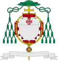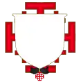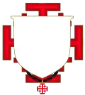 Cardinal grand maître | Le cardinal grand maître écartèle ses armes avec celles de l'ordre, d'argent à la croix de Jérusalem de gueules. Il le timbre du chapeau héraldique de gueules à 5 rangées de houppes et cordons de même. Le tout posé sur un manteau mouvant de la couronne d'épines surmontée du cimier. |