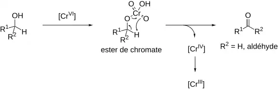 Comme pour la plupart des oxydations d'alcools basées sur un réactif de chrome(VI), la réaction passe par un ester de chromate qui se réarrange afin de donner un carbonyle et une espèce de chrome(IV). Le chrome(IV) est instable et finit par donner une espèce de chrome(III)[2].