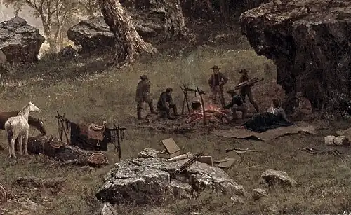 Le groupe rassemblé autour d'un feu au premier plan bas est constitué de géographes mandatés par le gouvernement fédéral américain afin d'établir des relevés topographiques en prévision d'une route devant relier l'océan Pacifique. Bierstadt a participé à cette expédition et il en a ramené des croquis préparatoires à ce tableau. Le groupe est constitué également d'artistes dont on aperçoit le matériel de dessin posé sur le rocher au premier plan : une ombrelle de peintre, une boîte de couleurs et divers outils, ceux-là mêmes que Bierstadt a ramenés de cette expédition[1].