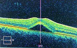 La tomographie en cohérence optique est un examen récent qui permet de réaliser une coupe quasi histologique de la rétine et de suivre l'évolution de la bulle maculaire. Son innocuité et sa facilité d'utilisation en feront sans doute un élément important de l'exploration des CRSC.