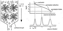 Le mécanisme d'exclusion stérique est fondé sur l’équilibre thermodynamique entre deux phases, le solvant interstitiel dans le volume mort et le solvant contenu dans le volume poreux . Si est le coefficient de partage, le volume d’élution d’une macromolécule est défini par :