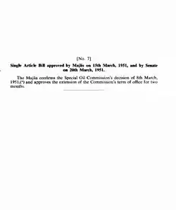 | Razmara demande la mise en place d'une Commission mixte composée de trois sénateurs et de trois députés du Parlement, qu'il chargerait d'analyser et d'évaluer l'accord Gass-Golshayan. Le Sénat rejette la demande par majorité, car il n'est pas compétent. | |