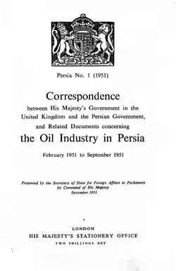 | 19 mai 1951 | L'ambassadeur britannique à Téhéran remet au gouvernement iranien un mémorandum dans lequel la position juridique britannique est réglée : Le gouvernement britannique conserve le droit à la Cour permanente d'arbitrage à La Haye pour faire appel. Le lendemain, le ministre iranien des Finances Varasteh informe la direction de l'AIOC, qu'il refuse ce droit. Les dirigeants de l'AIOC devront régler cette question avec la Commission pétrolière Parlementaire. |