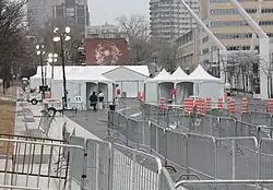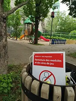 Le , François Legault annonce que le Québec interdit les visites dans les établissements de soins de longue durée et les hôpitaux, et conseille aux personnes de 70 ans et plus d'éviter de quitter leur domicile[75]. Plus tard dans la journée, le gouvernement annonce qu'il offrira des services de garde d'enfants gratuits aux personnes travaillant dans les services essentiels, avec jusqu'à 60 000 places disponibles, en utilisant les 400 écoles fermées par le gouvernement[76]. Le soir du , la Ville de Montréal annonce l'envoi d'employés à l'aéroport international Pierre-Elliott-Trudeau de Montréal pour conseiller les voyageurs arrivant de destinations internationales à se mettre en quarantaine pendant 14 jours, devant l'inaction du gouvernement fédéral, responsable de l'aéroport[77].