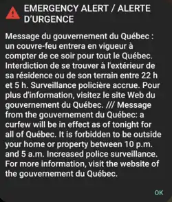 - ↑ (en) « Montreal, other Quebec red zones tightening restrictions again next week: Legault », sur MontrealCTVNews, (consulté le )