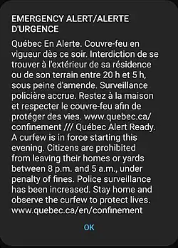 - ↑ Tommy Chouinard, « couvre-feu repasse à 21 h 30 dès lundi à Montréal et Laval », sur La Presse, (consulté le )